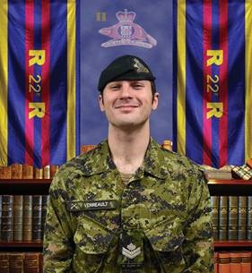 Le Cplc Verreault quittera les Forces armées canadiennes le 5 janvier 2021, après 10 ans au sein du R22eR et près de 15 ans au sein des Forces armées.